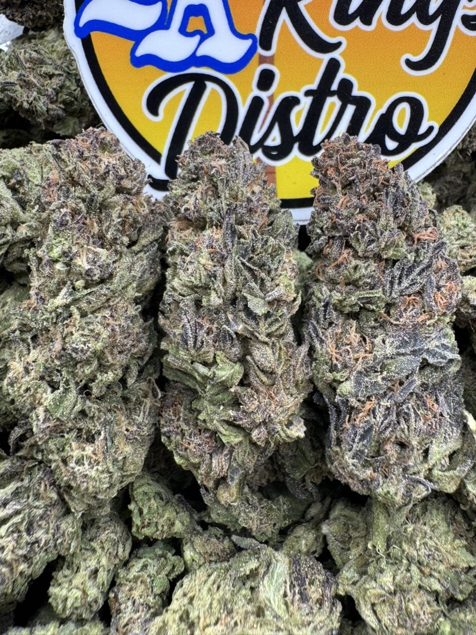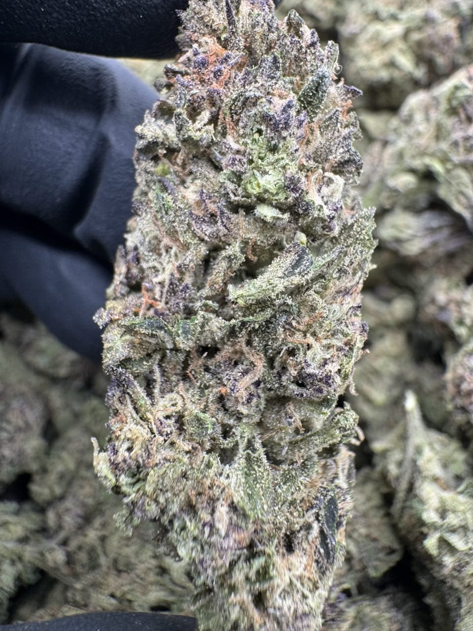 Visually, this strain is a true top-shelf masterpiece. Expect vibrant green buds accented with deep purple hues, bright orange pistils, and a heavy coating of frosty trichomes that give it a sparkling, premium appearance. Its bag appeal alone makes it a favorite among collectors and cannabis enthusiasts.